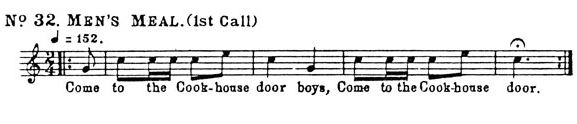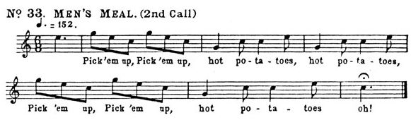 The "Pick-em-up, Pick-em-up, hot potatoes" line refers to one of the many British army's bugle calls -- this one being the second call for men to eat. The first and second calls: