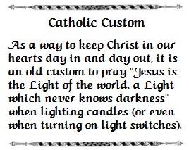 Catholic families make use of votive candles at home, too, especially at family altars and, of course, during the Advent and Christmas Seasons with their respective candles, and in the Easter Season, with a white candle symbolizing the Light of Christ ("Lumen Christi").