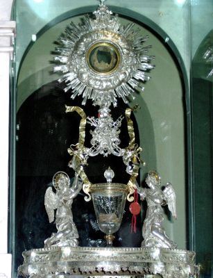 The incident was investigated by the Bishop at the time, and again in 1574 by Archbishop Antonio Gaspar Rodríguez, who canonically recognized the event. Over the centuries, the Franciscans came to be in charge of the church (now known as the church of St. Francis) and, hence, the Body and Blood, which where eventually housed in a silver monstrance dating to 1713, and a 17th century crystal chalice, respectively (see picture at the bottom of this page).